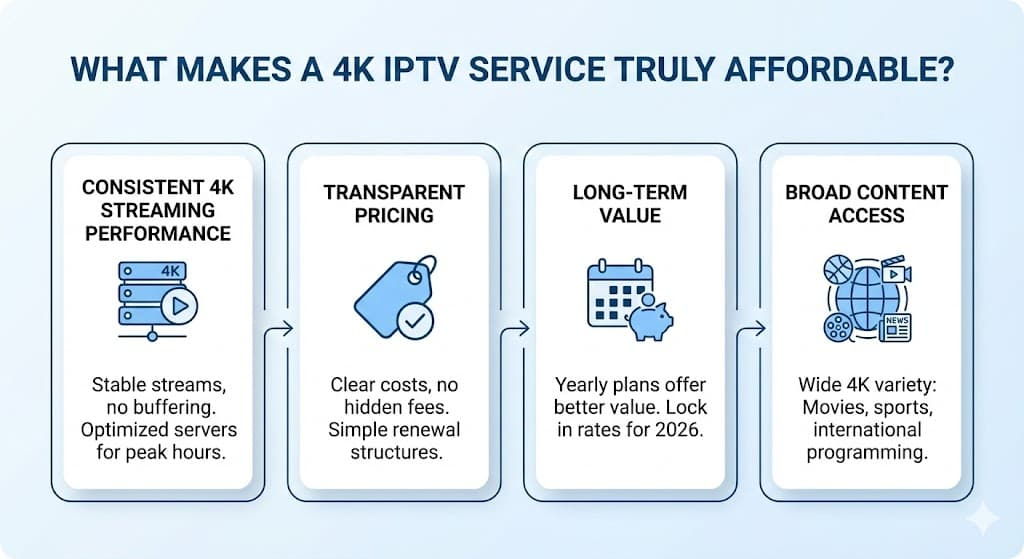 Affordability does not simply mean the lowest price. A truly affordable 4K IPTV service balances cost, performance, and reliability.